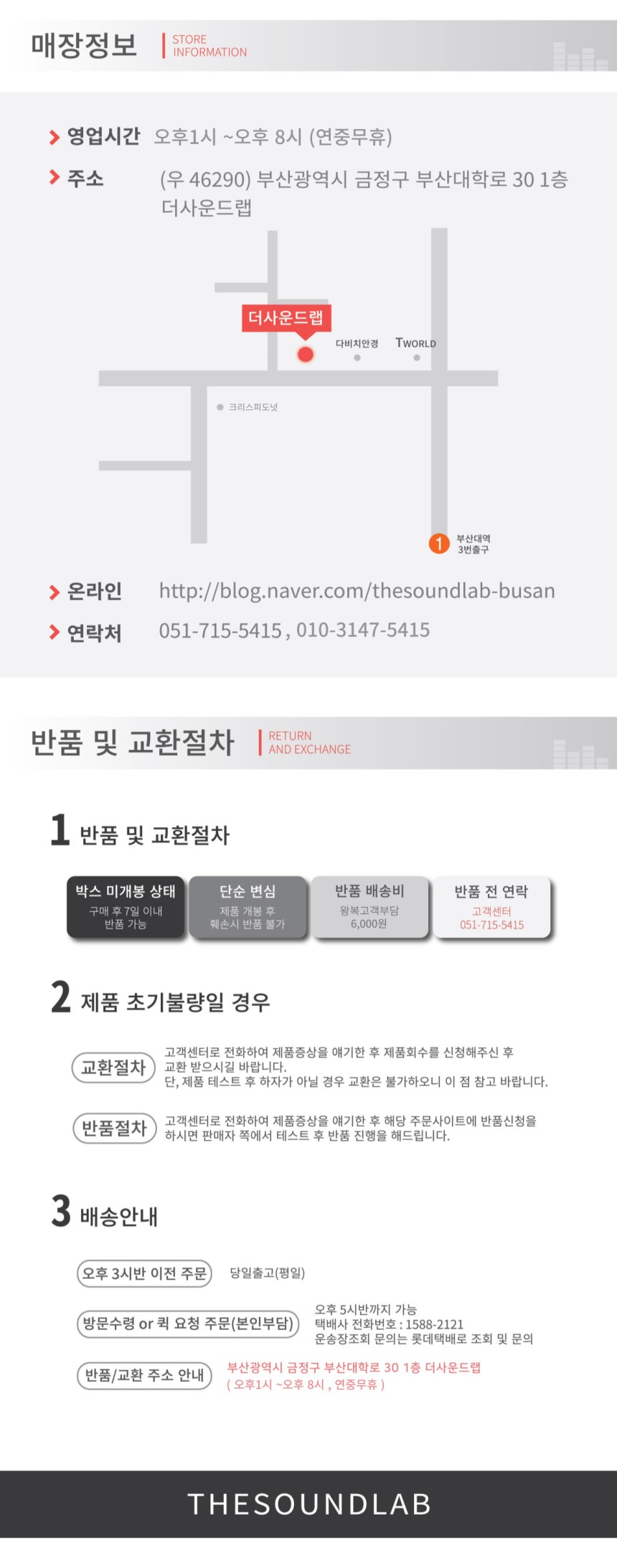 - 기타 구매 및 상품 관련 문의는 051-715-5415, 010-3147-5415 또는 카카오톡 ID THESOUNDLAB(대소문자 구분 없음)으로 문의하여 주시기 바랍니다.